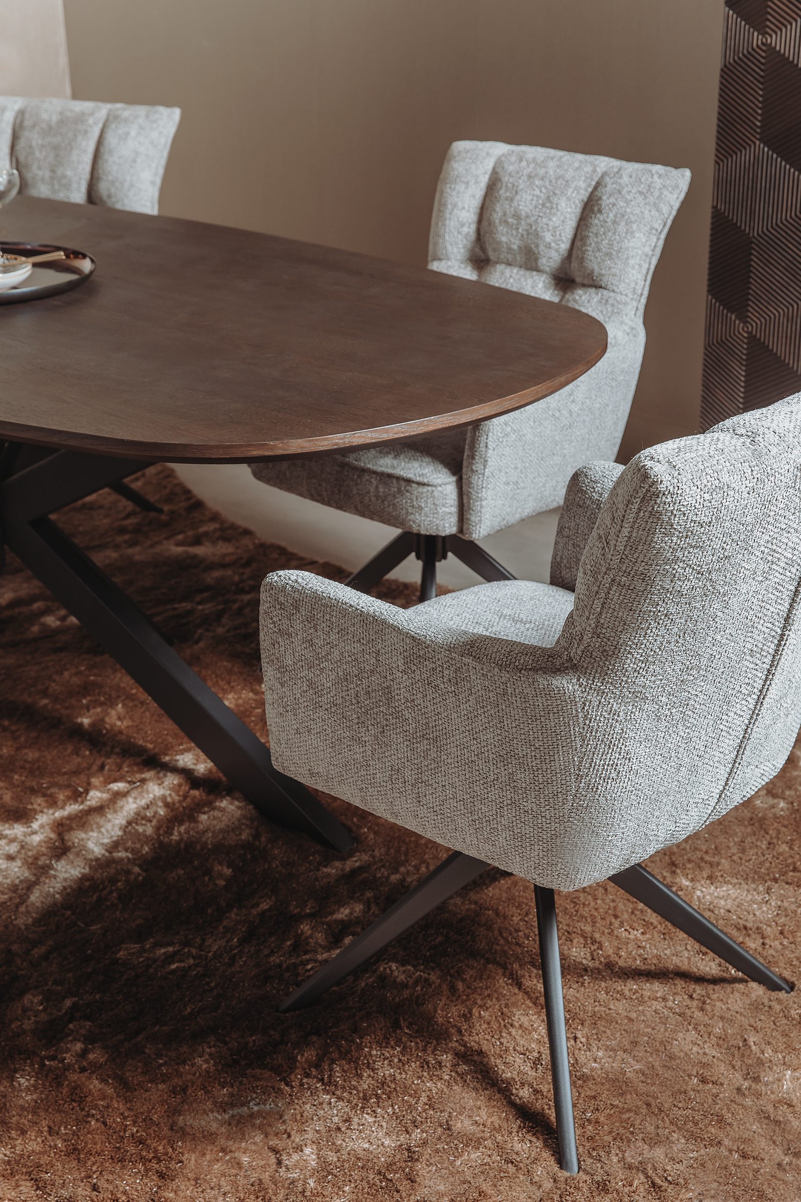 Ontdek de veelzijdigheid van de Rosora Armstoel, een stijlvolle toevoeging aan je eetkamer of werkruimte. Deze draaibare stoel is bekleed met een zachte, beige stof die uitnodigt tot lange, gezellige diners of productieve werkuren.